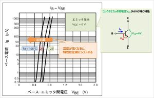 ベース-エミッタ間電圧VBEはベース電流依存性を持っており、ベース電流IBが多いほどベース-エミッタ間電圧VBEが高くなる。