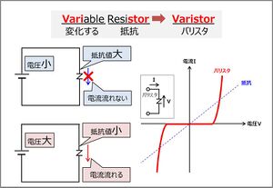 バリスタとは、印加電圧が低い場合は抵抗値が大きく、印加電圧が高い場合は抵抗値が小さくなる性質を持っている。