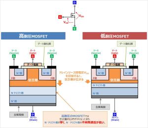 このN-ドリフト層の空乏層を伸ばすことにより、MOSFETは耐圧を確保している。