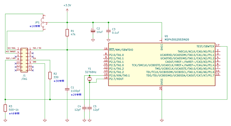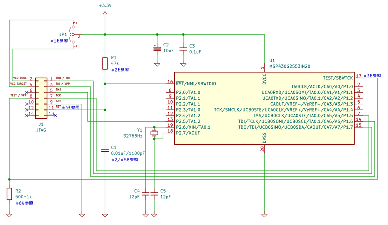 MSP430G2553は、JTAGとSBW (Spy-Bi-Wire) の両方をサポートする最新世代のデバイスである。