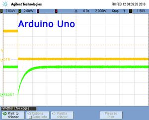 下図に、スケッチがArduinoにアップロードされた時、オシロスコープにより計測されたリセットパルスを示す。